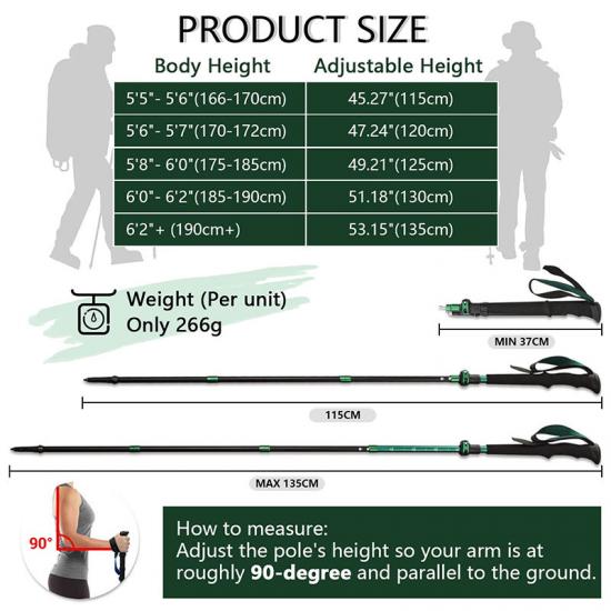 Благодаря системе комбинированного замка эта треккинговая палка сочетается с быстрой фиксацией и поворотным замком, а в области поворотного замка встроена противоударная пружина, поэтому вы меньше повреждаете. Вы можете двигаться быстрее и быстрее, используя энергию. Регулируемая высота, пешеходные палки подойдут большинству людей. Кроме того, треккинговые палки с четкой градуировкой и стопорным наконечником, длина которого может составлять от 25 до 53 дюймов, настолько маленькие и легкие, насколько это возможно. Подходит для любого роста, от низкого до высокие мужчины, женщины и даже дети! Будьте осторожны, не превышайте его.
