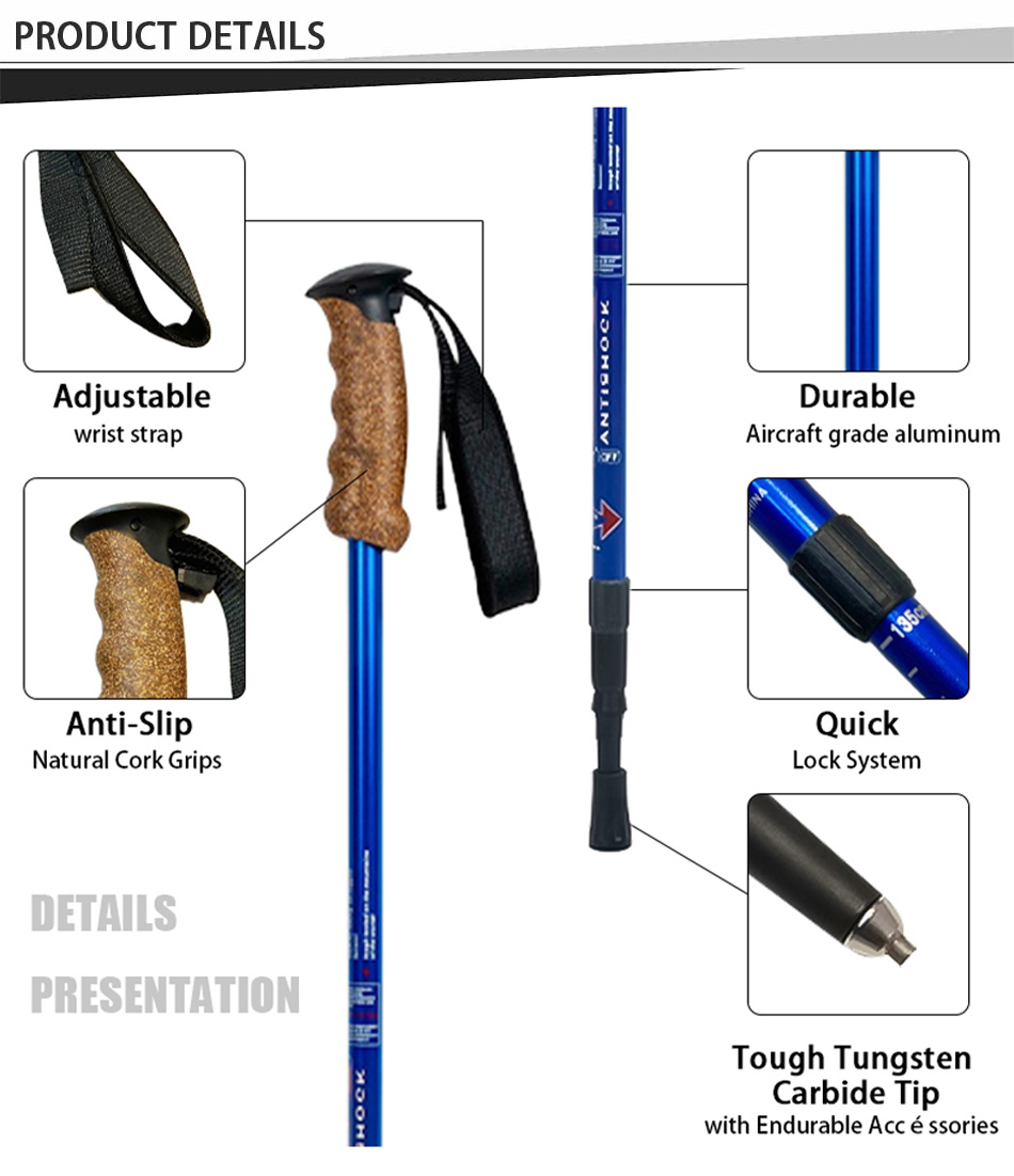Продукт : Регулируемые трекинговые палки, изготовленные из прочного алюминия марки 7075, отличаются легкой складной конструкцией, быстросъемными фиксаторами, эргономичными рукоятками и надежной устойчивостью для треккинга, альпинизма и активного отдыха на природе.