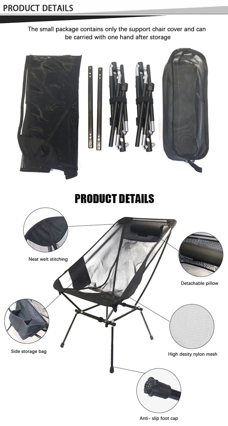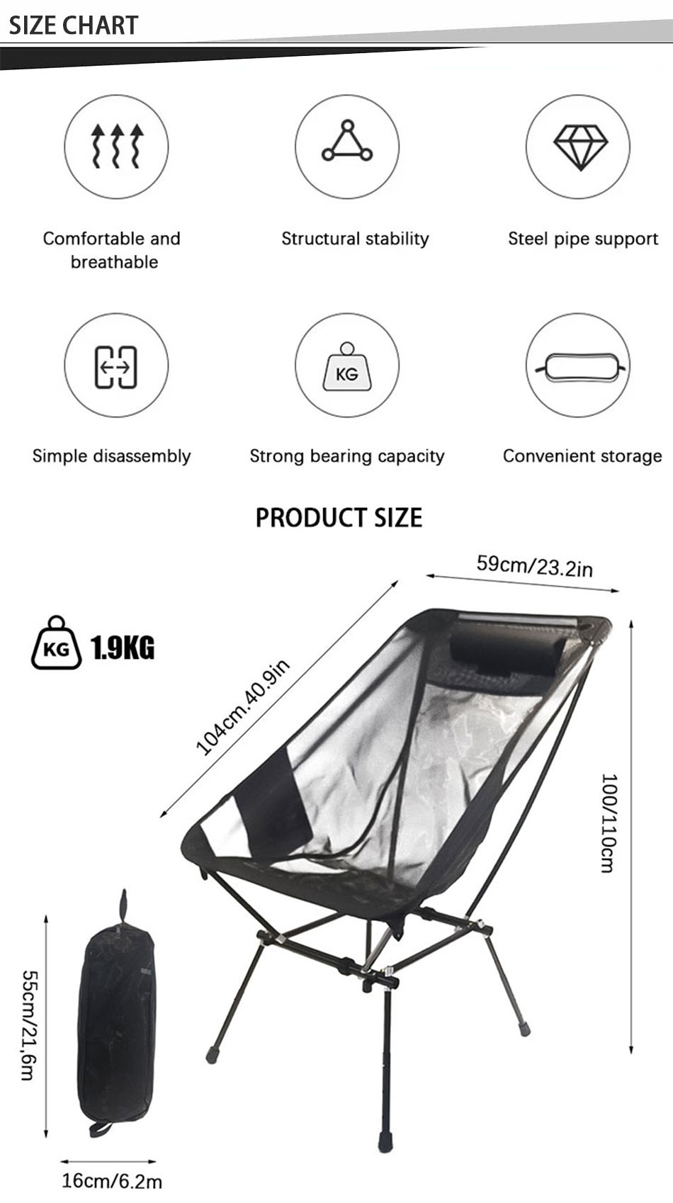 Продукт : Эти кемпинговые пикники черная нейлоновая сетка легкие металлические складные пляжные стулья предлагают дышащий комфорт, долговечность и портативность, что делает их идеальными для приключений на свежем воздухе, пляжных поездок и пикников.
