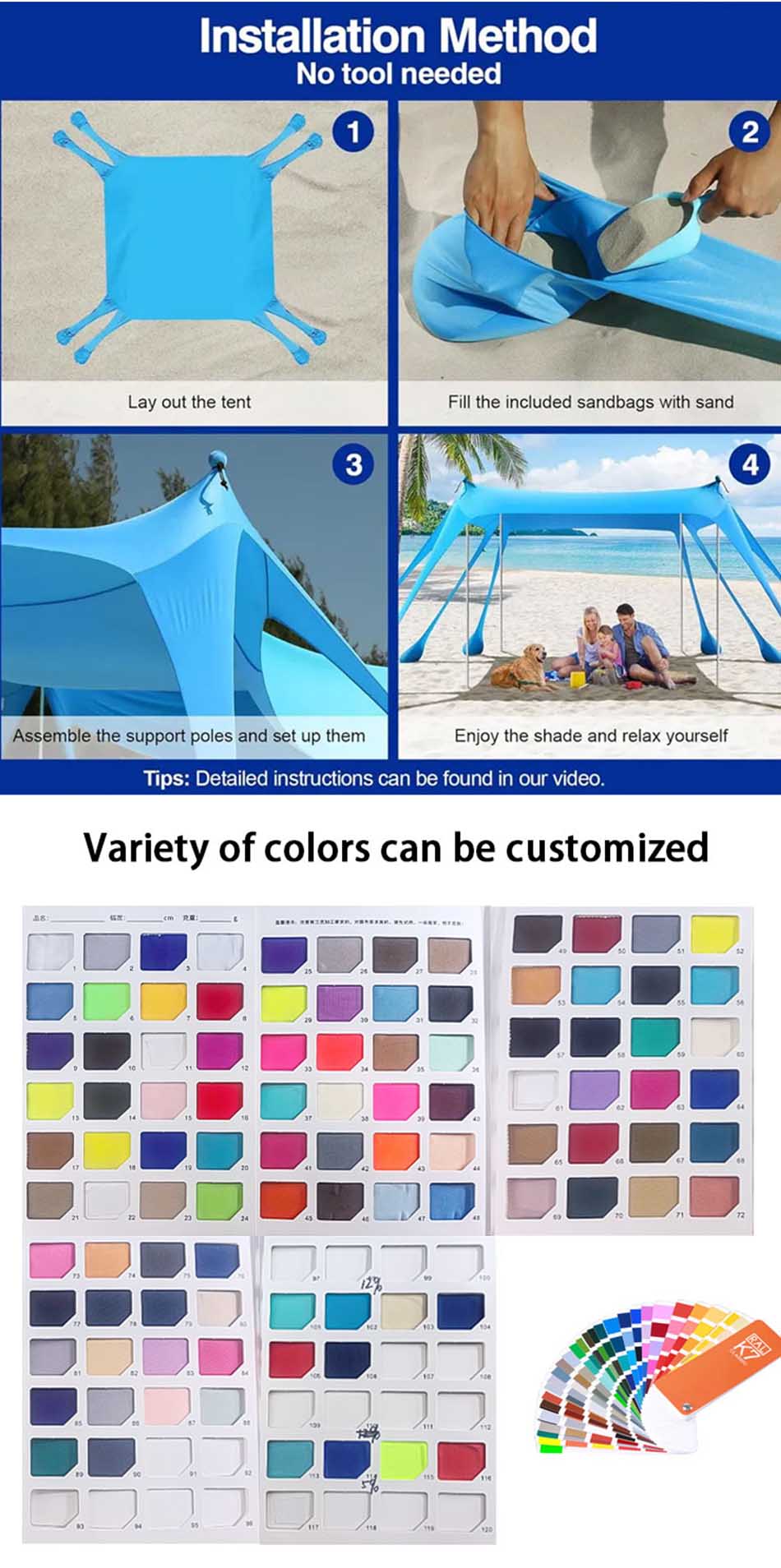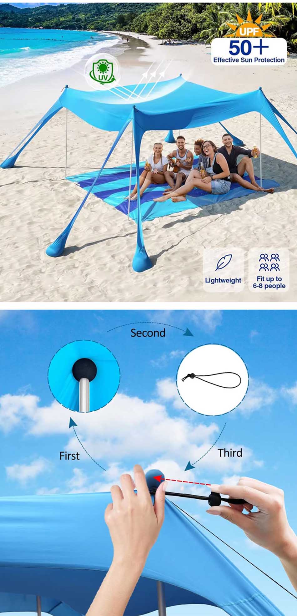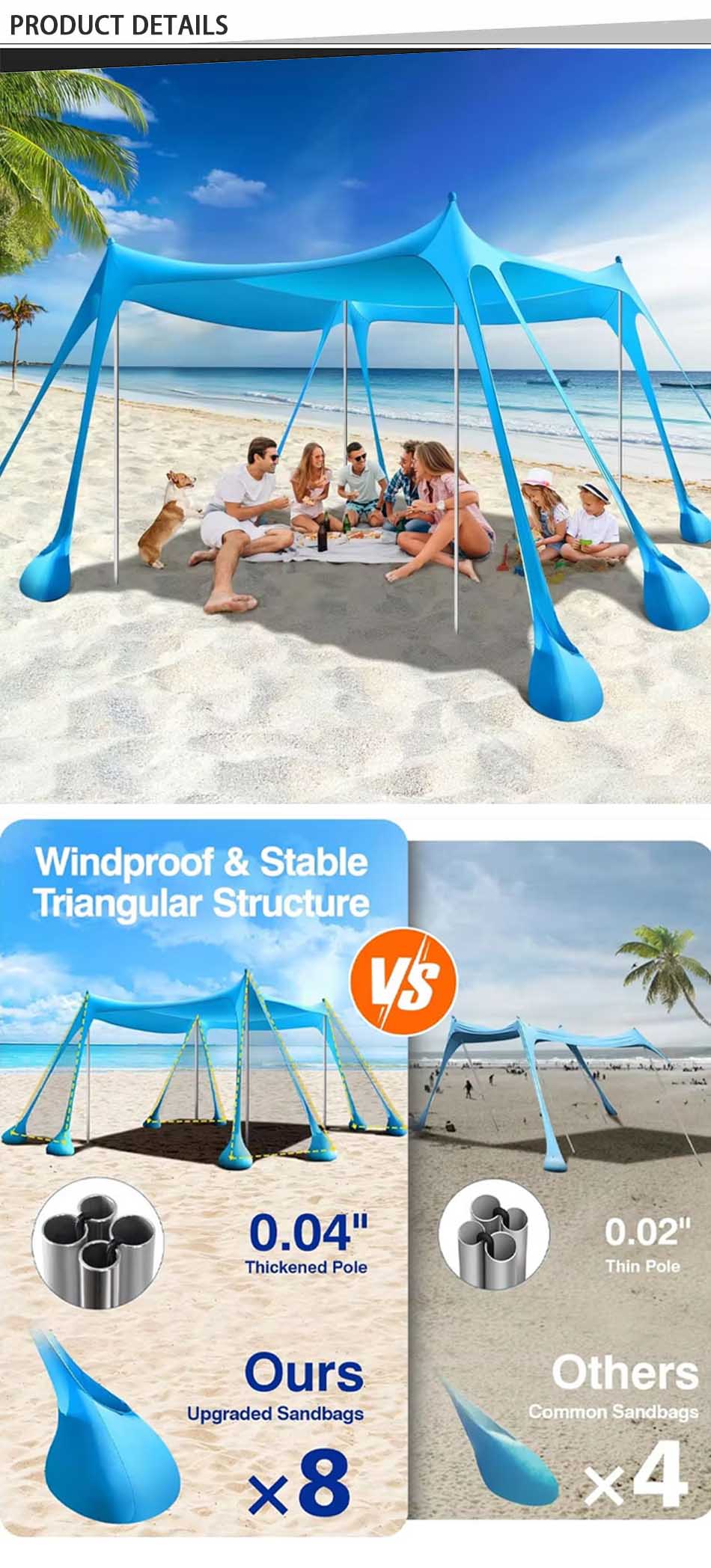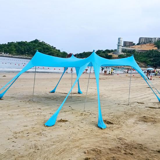 Продукт : Этот кемпинговый солнцезащитный тент обеспечивает надежную защиту от ультрафиолета и воздухопроницаемость, что делает его идеальным переносным пляжным навесом для отдыха на свежем воздухе и безопасности на солнце.