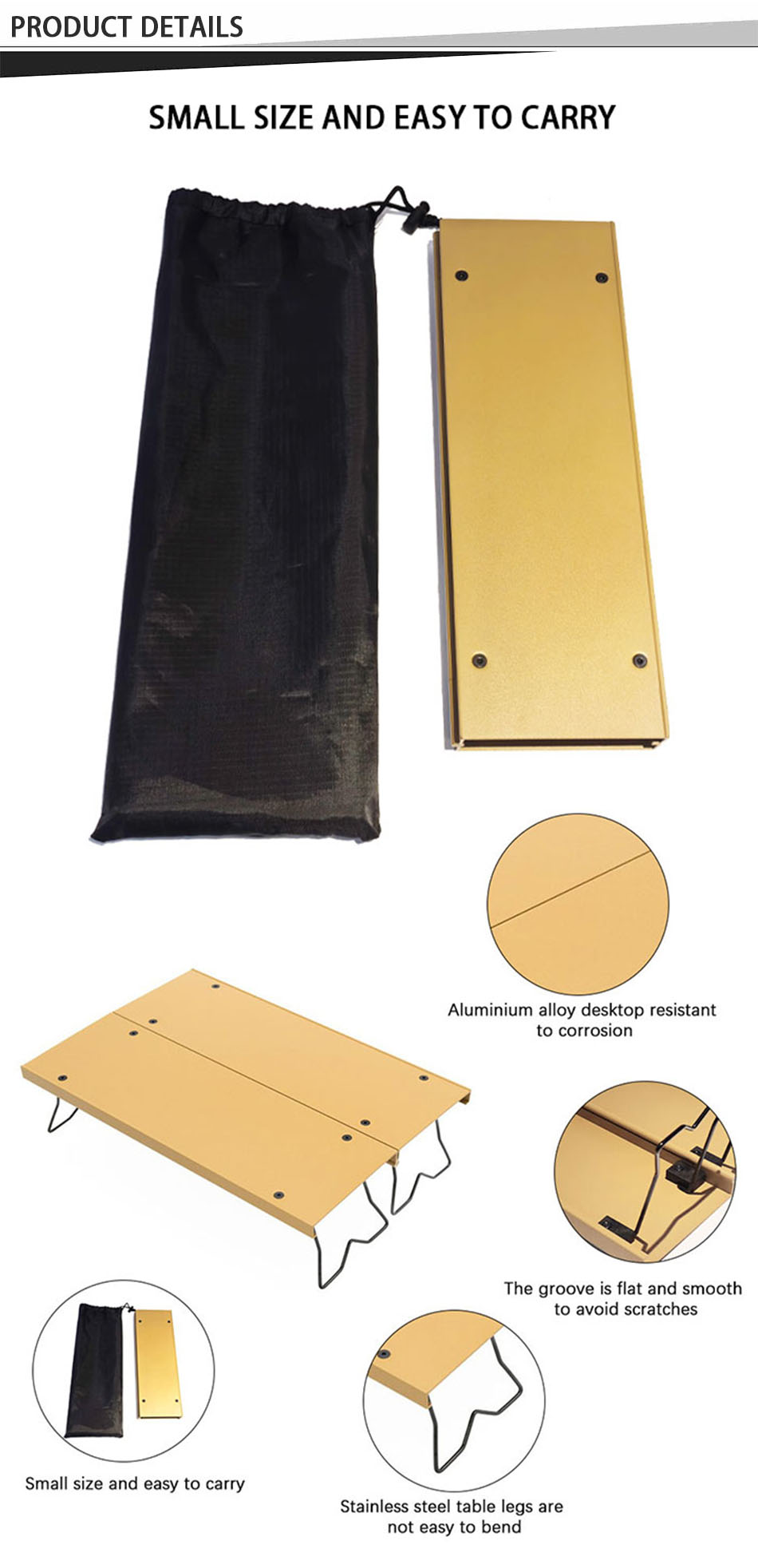 1. Конструкция складного походного стола : складная конструкция стола удобна для переноски и экономит место. 2. Легко собрать, другие инструменты не нужны, стол можно собрать всего за несколько секунд, что экономит время и усилия. 3. Супер прочный и стабильный: изготовлен из высококачественного алюминиевого сплава, прочный и долговечный, водонепроницаемый и легко чистится. 4. Индивидуальное обслуживание: на выбор предлагаются различные размеры и цвета, а также вы можете настроить логотип. 5. Многоцелевой: особенно подходит для активного отдыха, использования в качестве уличного стола для кемпинга, пеших прогулок, пикника, барбекю, стола для пикника, рыбалки, пляжа и использования в помещении.