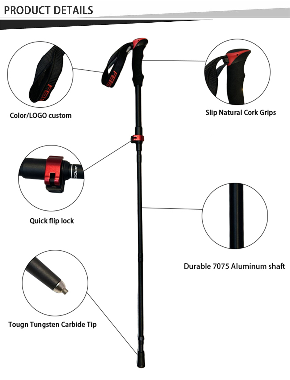 Продукт : Трекинговые палки с индивидуальным логотипом отличаются легкой алюминиевой конструкцией, складной структурой, регулируемой высотой и прочными удобными рукоятками, обеспечивая надежную поддержку во время походов, путешествий и приключений на открытом воздухе.