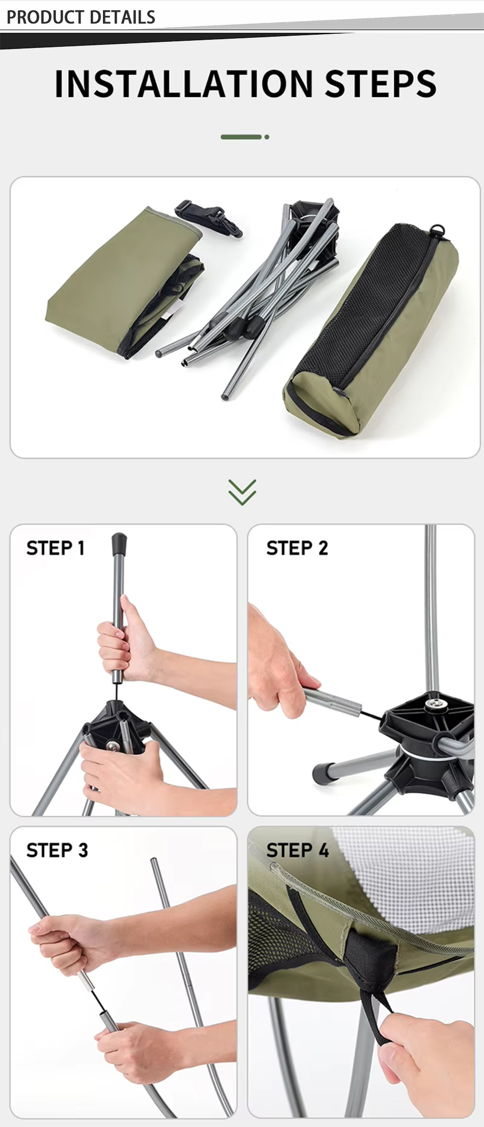 Бренд : ANHUI FEISTEL FACTORY Сопутствующее производство : OEM и ODM Продукт : Сверхлегкое походное кресло с высокой спинкой и сумкой для переноски, идеально подходящее для приключений на свежем воздухе, обеспечивающее комфорт, долговечность и удобство переноски.