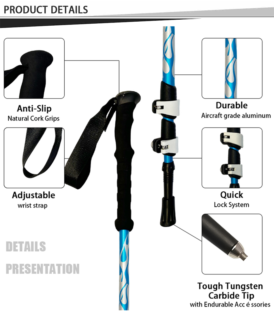 Продукт : Сверхпрочные, ультралегкие, регулируемые телескопические треккинговые палки оснащены прочным наконечником из вольфрамовой стали и удобной рукояткой из материала EVA, обеспечивая стабильную и надежную опору для пеших походов, треккинга и приключений на открытом воздухе.