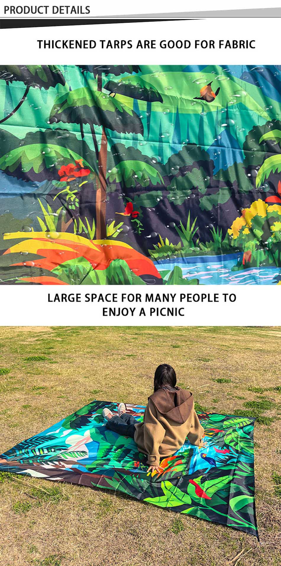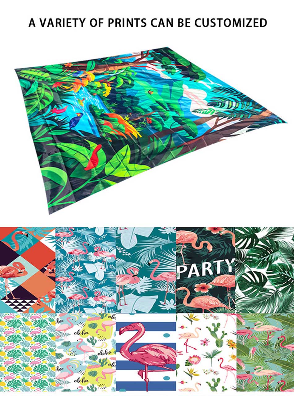 Продукт : Этот большой водонепроницаемый коврик-одеяло для пикника идеально подходит для походов, кемпинга или использования на пляже. Он изготовлен из прочных материалов и оснащен индивидуальными принтами для комфорта и стиля на открытом воздухе.