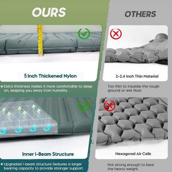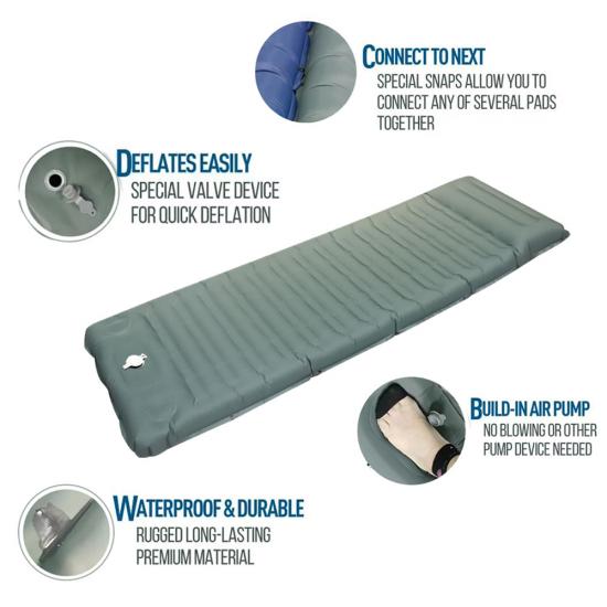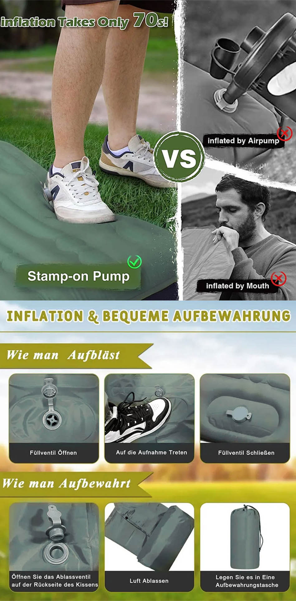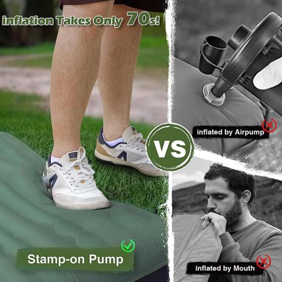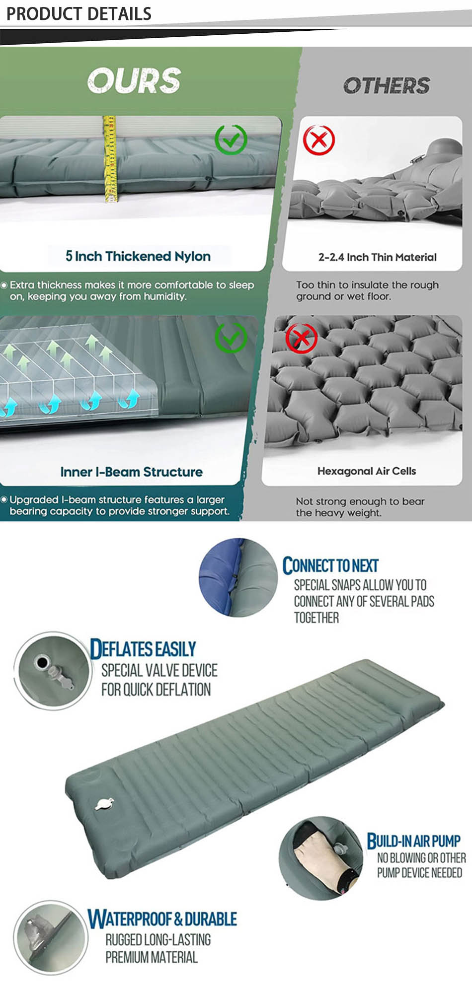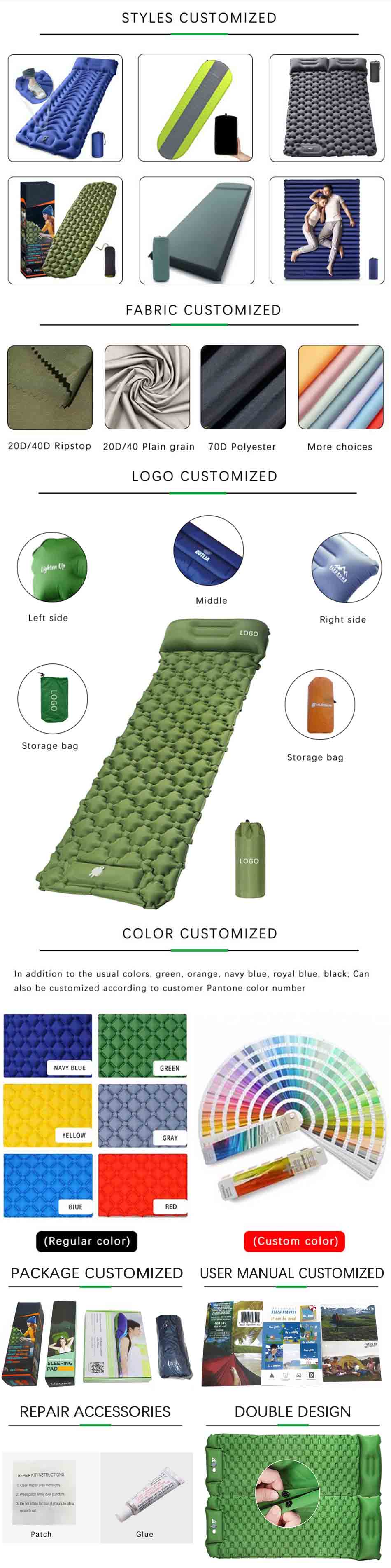 Продукт : Этот легкий надувной коврик для кемпинга обеспечивает комфорт и поддержку во время приключений на свежем воздухе, что делает его идеальным спальным ковриком для пеших прогулок, кемпинга или походов с рюкзаком.
