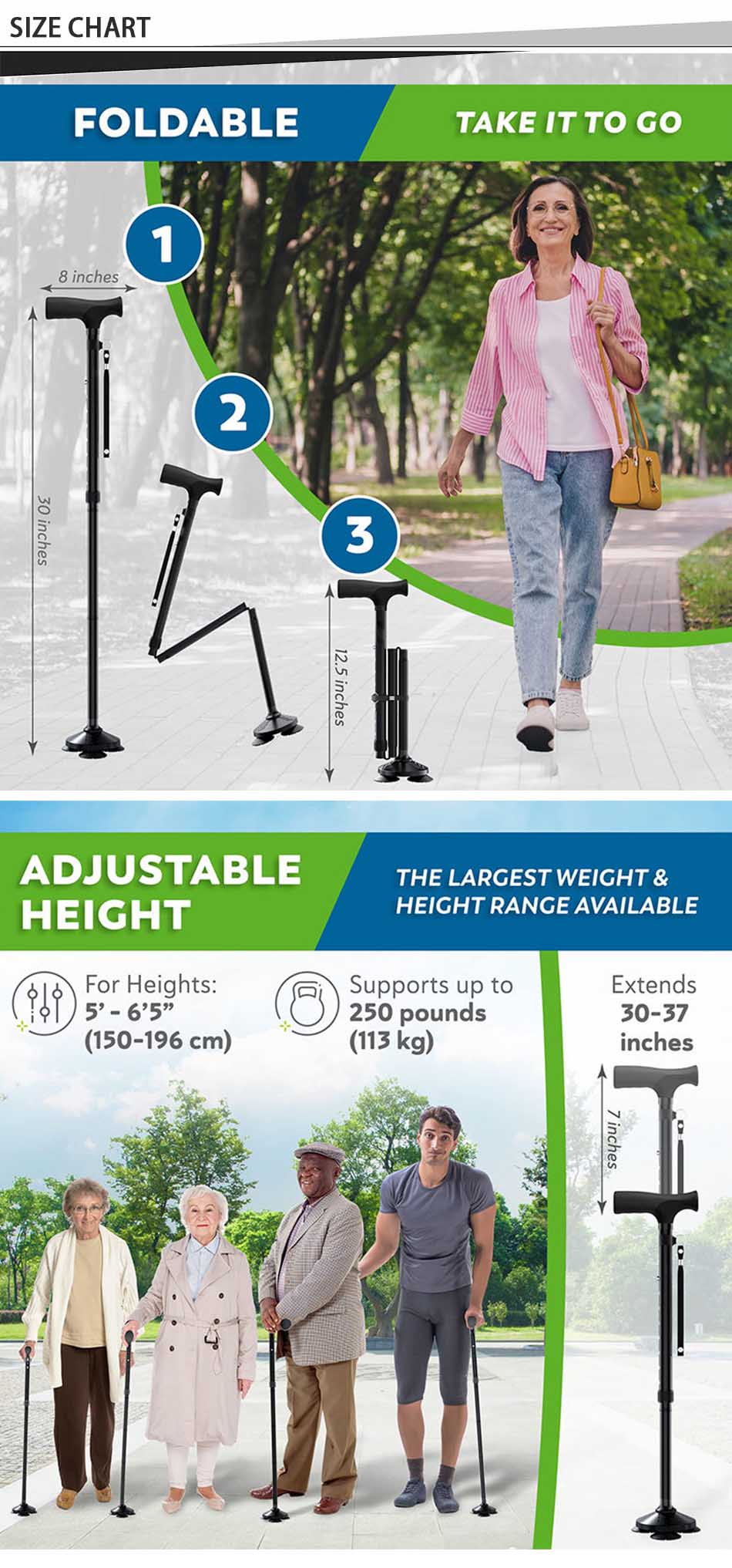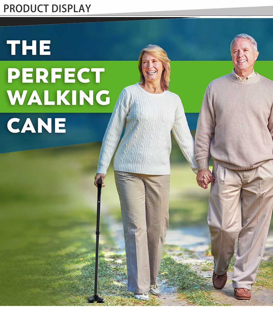 Продукт : Новая трость для пожилых людей имеет складную конструкцию, удобную Т-образную ручку, устойчивое нескользящее основание и прочную конструкцию, обеспечивая пожилым пользователям улучшенное равновесие, безопасность и поддержку при ходьбе на открытом воздухе.