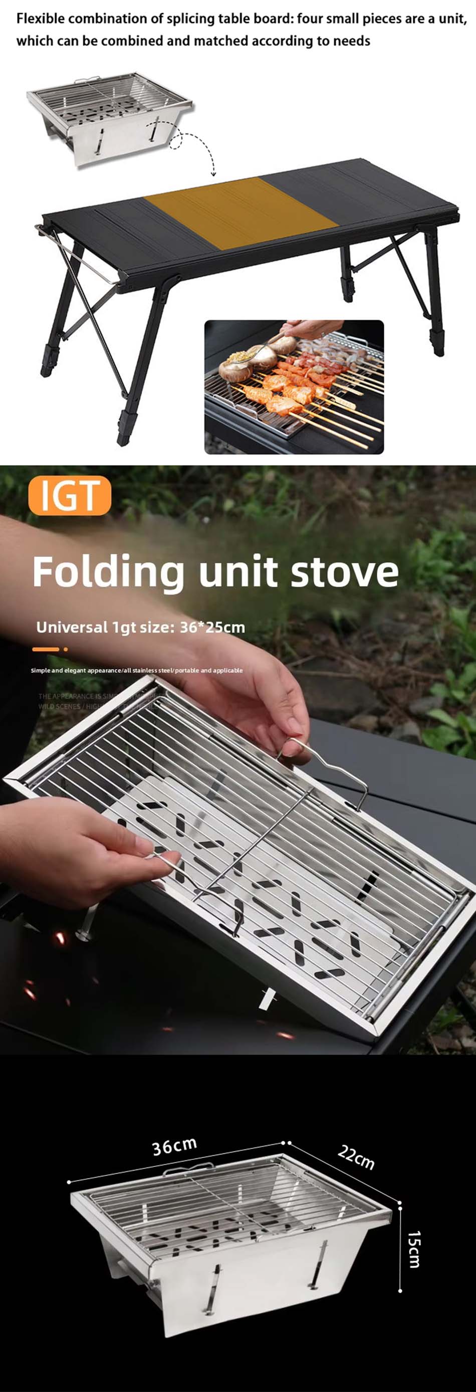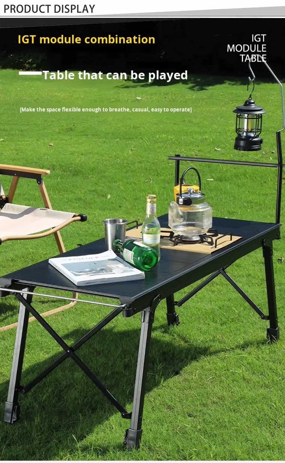 Продукт : Легкий алюминиевый складной кемпинговый стол IGT Х-образной формы с регулируемой высотой обеспечивает высокую устойчивость, быструю установку, компактное хранение и универсальность для приготовления пищи, приема пищи и отдыха на природе.