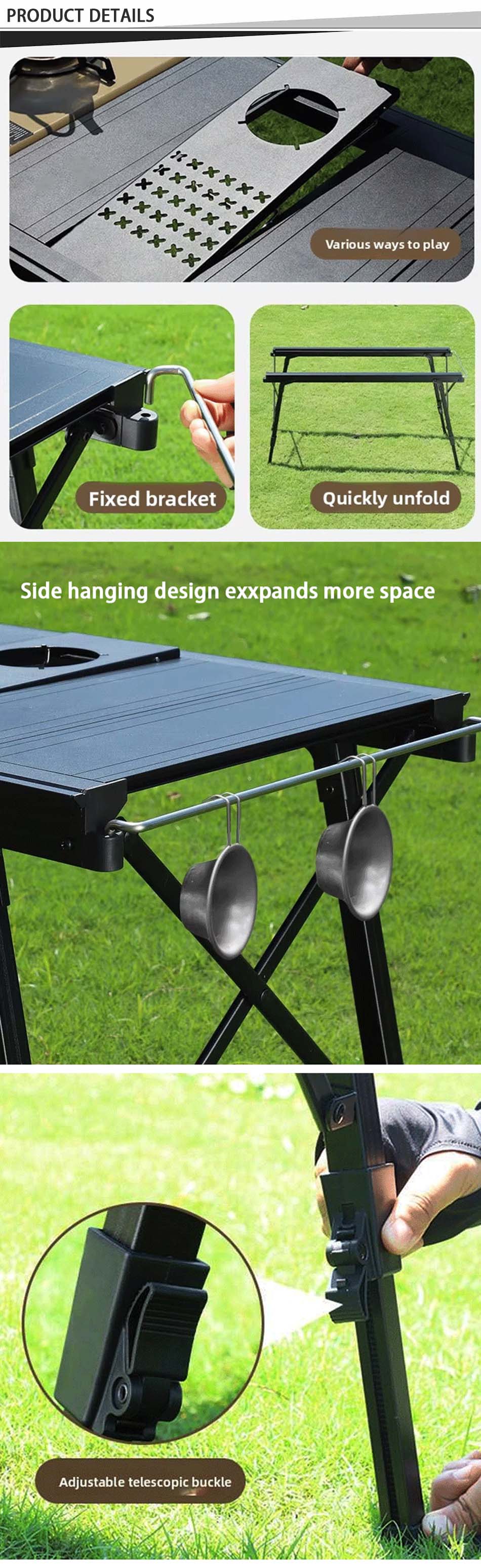 1. Конструкция складного походного стола : складная конструкция стола удобна для переноски и экономит место. 2. Легко собрать, другие инструменты не нужны, стол можно собрать всего за несколько секунд, что экономит время и усилия. 3. Супер прочный и стабильный: изготовлен из высококачественного алюминиевого сплава, прочный и долговечный, водонепроницаемый и легко чистится. 4. Индивидуальное обслуживание: на выбор предлагаются различные размеры и цвета, а также вы можете настроить логотип. 5. Многоцелевой: особенно подходит для активного отдыха, использования в качестве уличного стола для кемпинга, пеших прогулок, пикника, барбекю, стола для пикника, рыбалки, пляжа и использования в помещении.