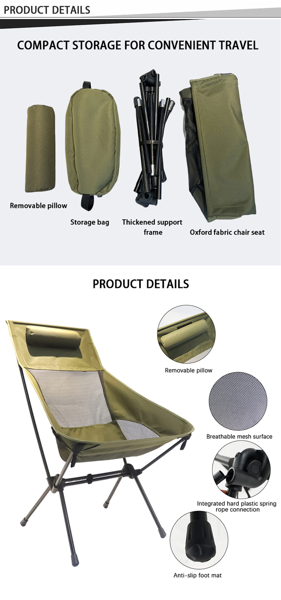 Бренд : ANHUI FEISTEL FACTORY Сопутствующее производство : OEM и ODM Продукт : Сверхлегкое походное кресло с высокой спинкой и сумкой для переноски, идеально подходящее для приключений на свежем воздухе, обеспечивающее комфорт, долговечность и удобство переноски.