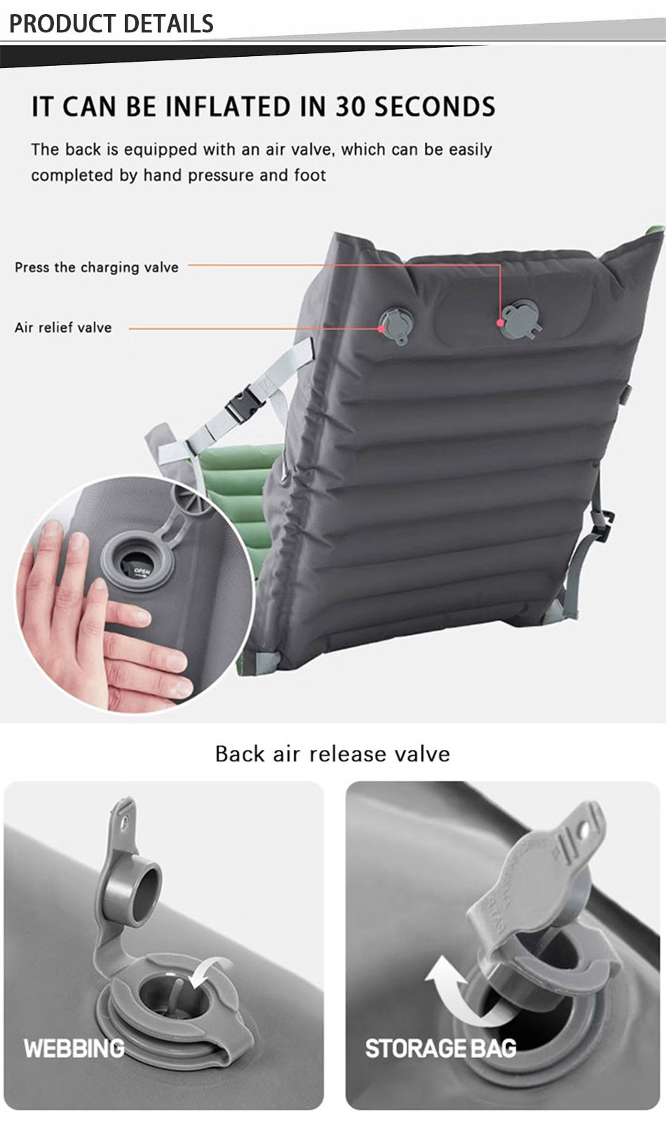 Продукт : Надувной спальный коврик с регулируемым углом наклона для отдыха на природе на пляже предлагает малый вес, комфорт, универсальную поддержку наклона и компактность для отдыха на открытом воздухе.