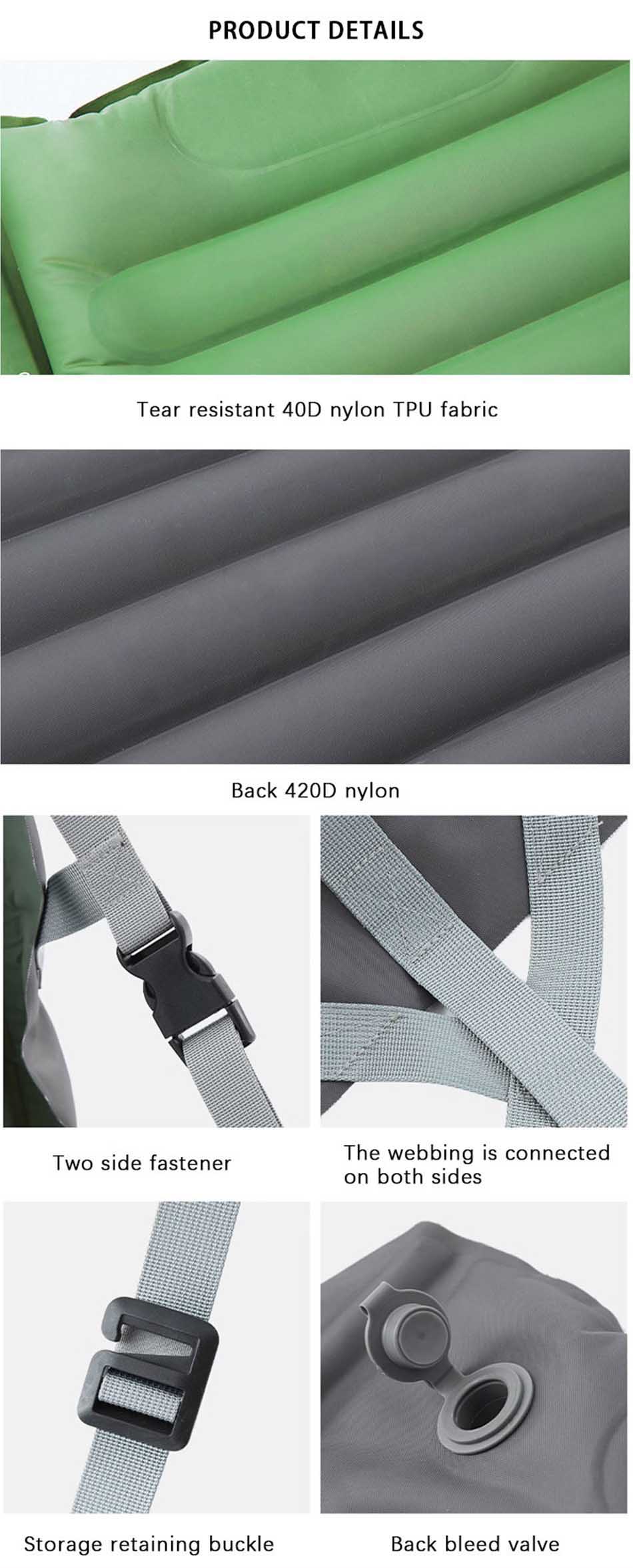 Автоматические надувные коврики для кемпинга на открытом воздухе - очень практичное снаряжение для активного отдыха. Он изготовлен из материала Chunya Textile и покрыт ПВХ, который обладает характеристиками высокой эластичности, комфорта и износостойкости.