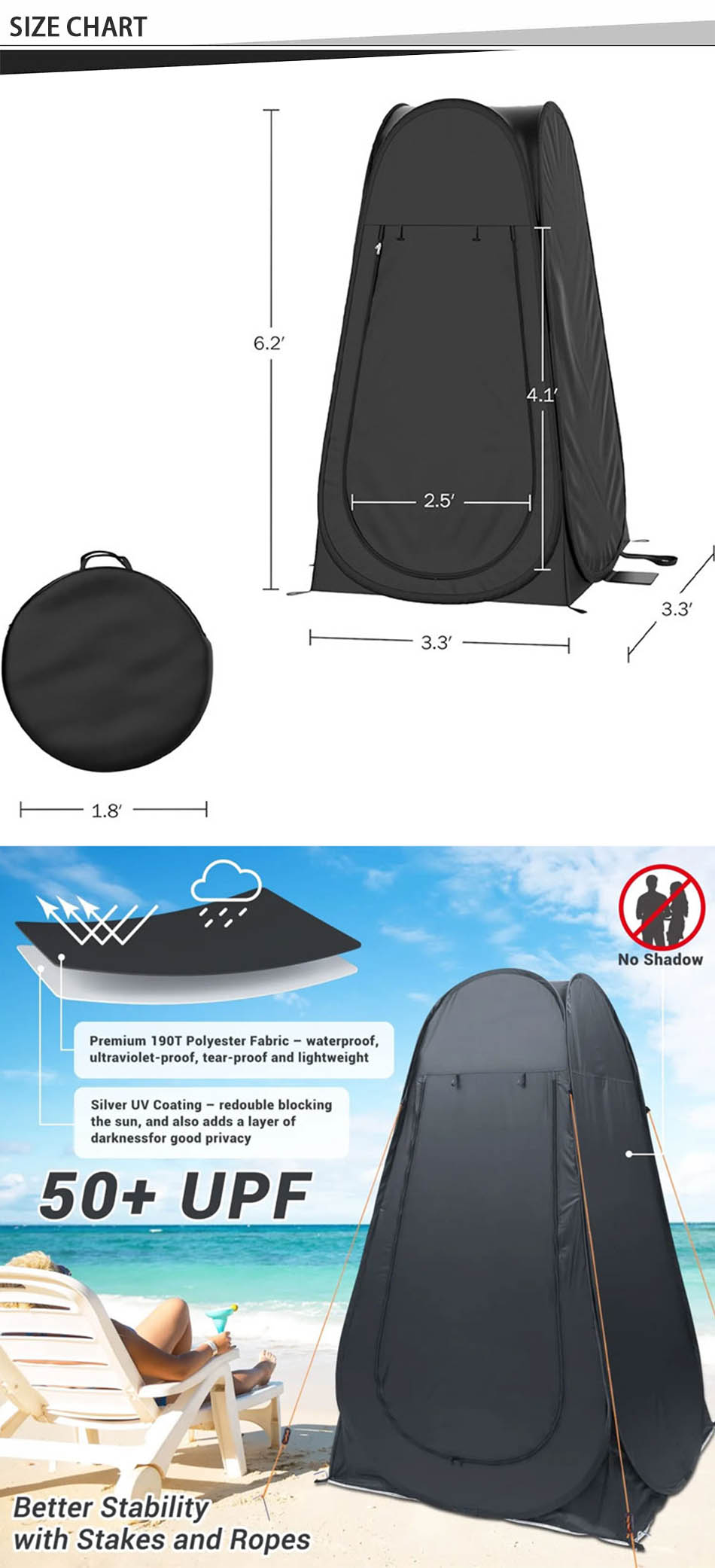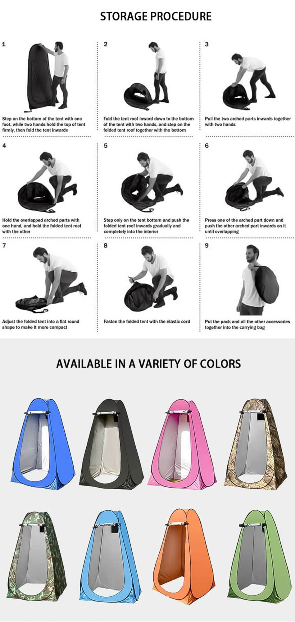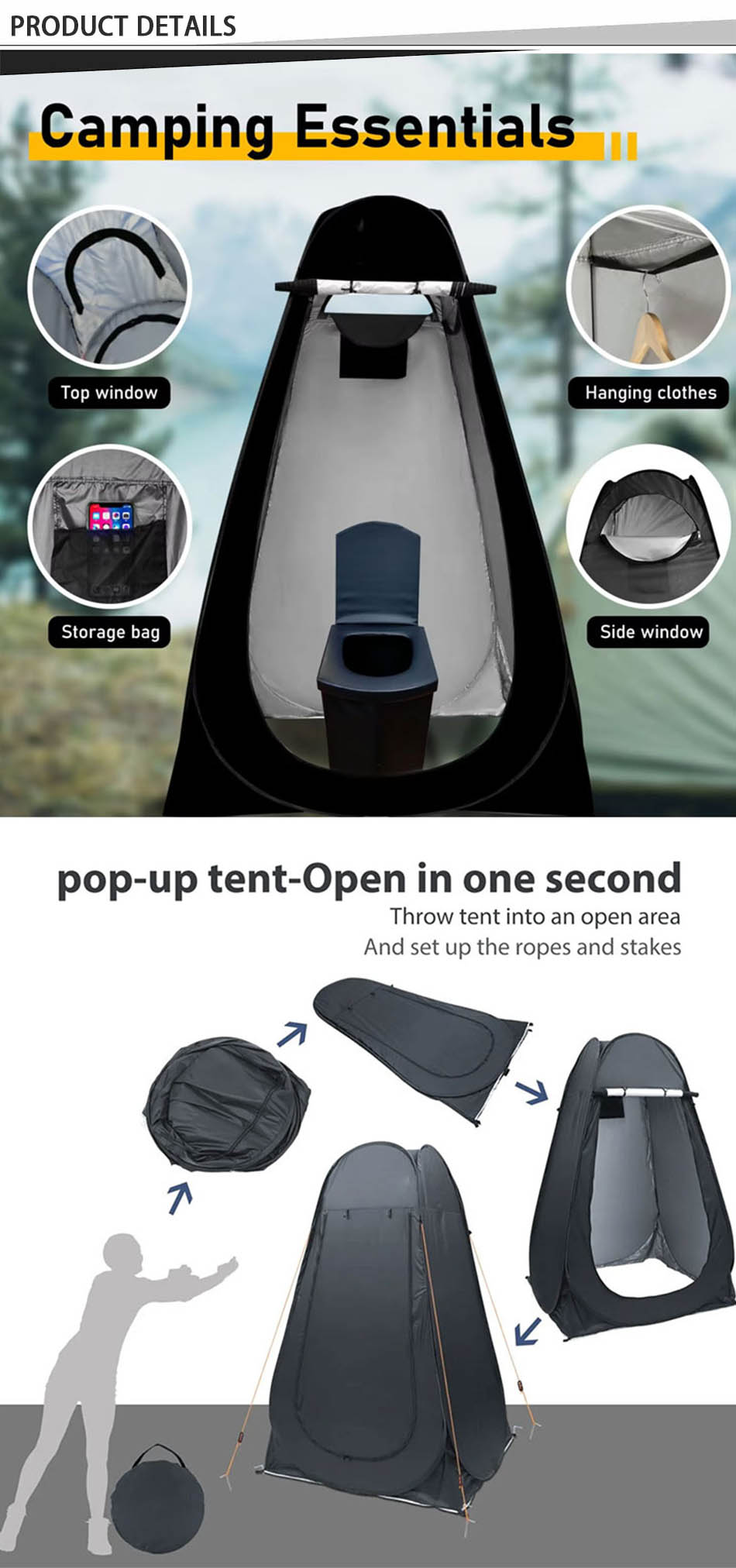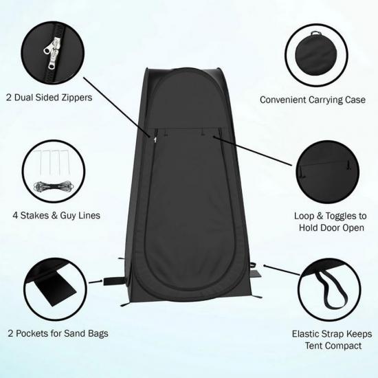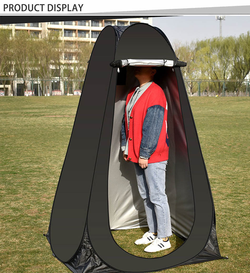 Продукт : Эта переносная складная душевая палатка для кемпинга на открытом воздухе обеспечивает мгновенное уединение во время одевания, переодевания или использования в качестве туалетной палатки — легкая, простая в установке и универсальная.