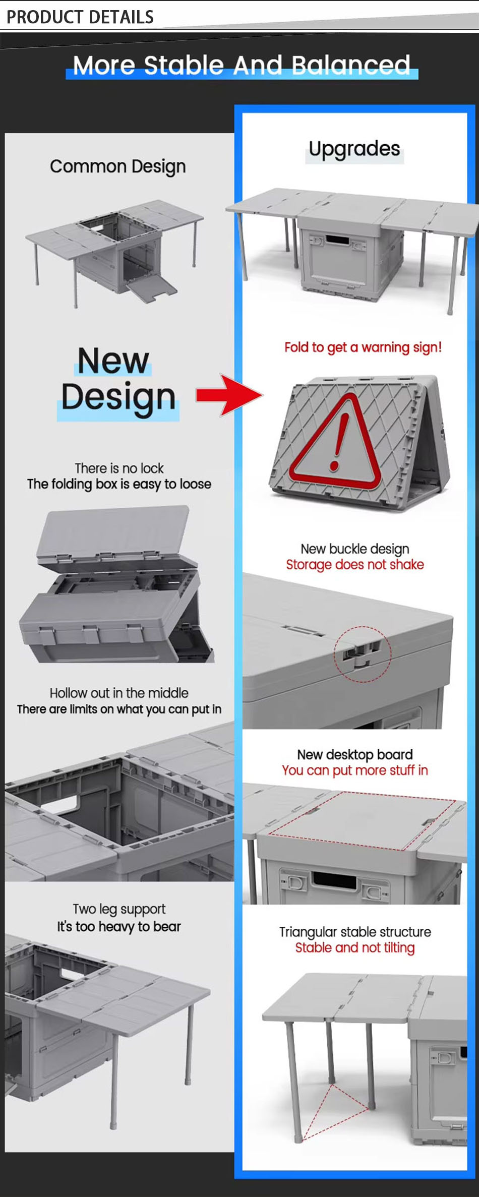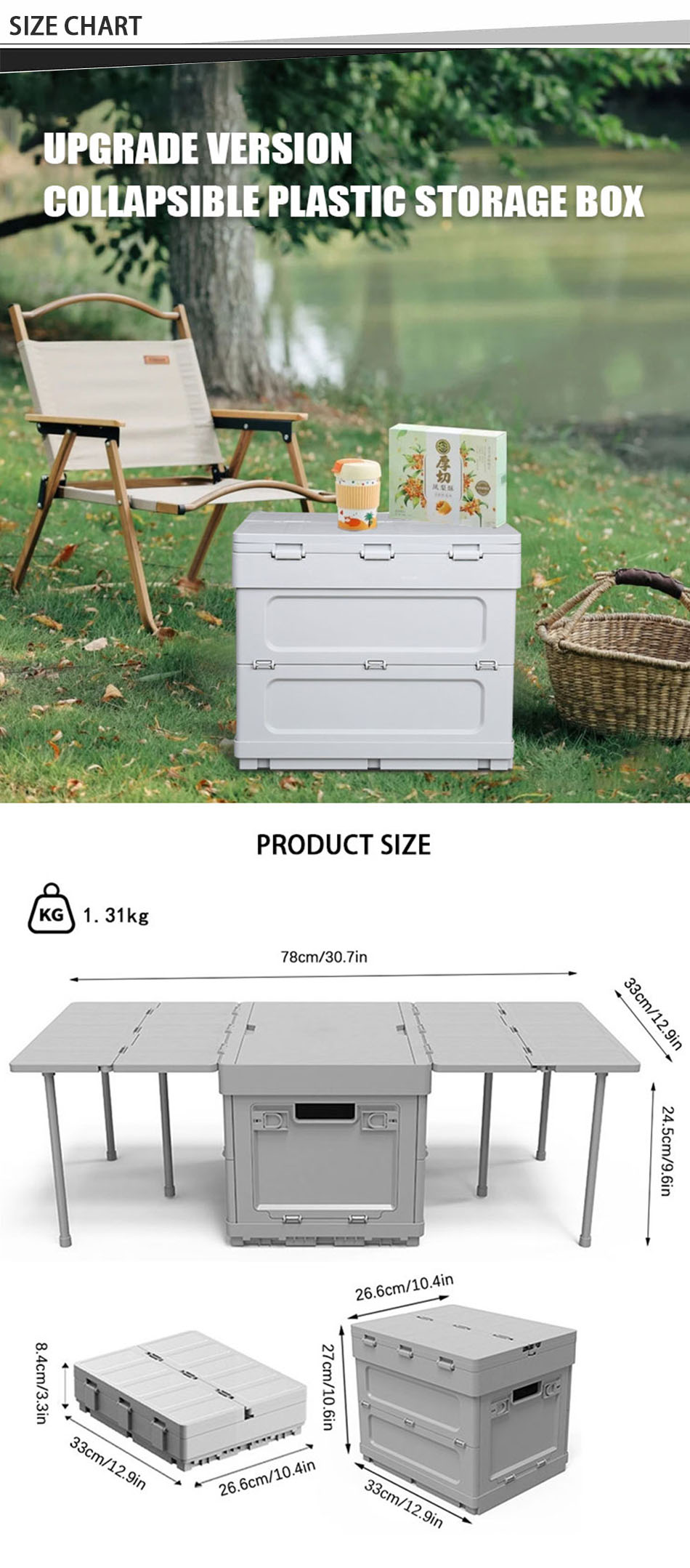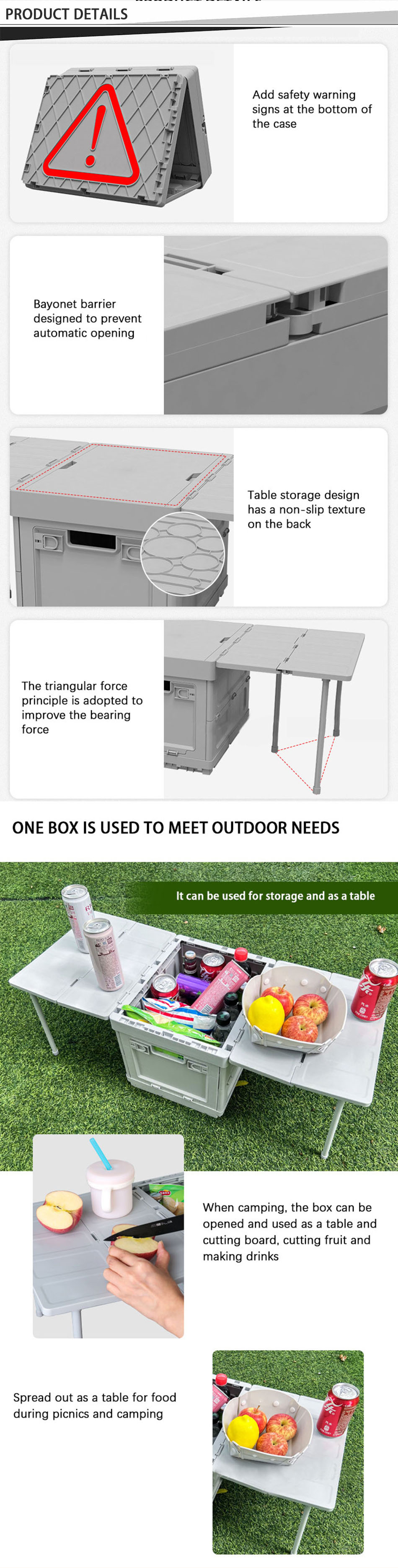 Продукт : В этой открытой многофункциональной пластиковой ящике для хранения есть складной, защищенный от влаги, обеспечивая прочное и удобное хранение для кемпинга, путешествия и различные занятия на свежем воздухе.