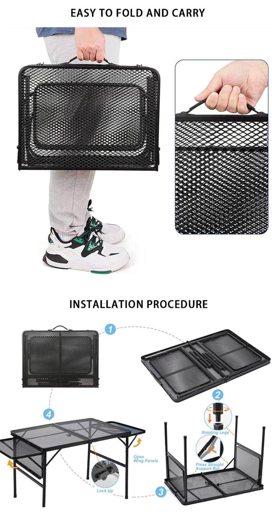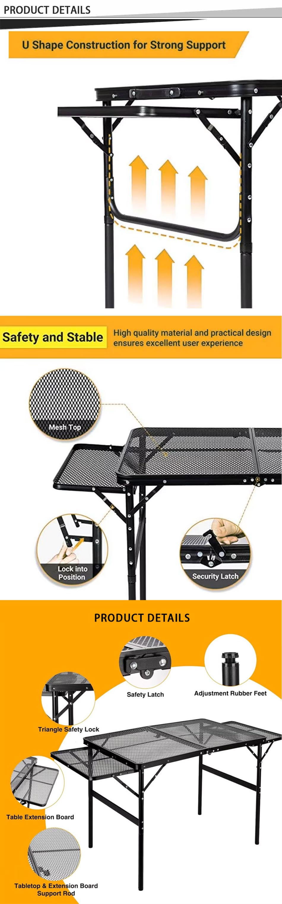 1. Конструкция складного походного стола : складная конструкция стола удобна для переноски и экономит место. 2. Легко собрать, другие инструменты не нужны, стол можно собрать всего за несколько секунд, что экономит время и усилия. 3. Супер прочный и стабильный: изготовлен из высококачественного алюминиевого сплава, прочный и долговечный, водонепроницаемый и легко чистится. 4. Индивидуальное обслуживание: на выбор предлагаются различные размеры и цвета, а также вы можете настроить логотип. 5. Многоцелевой: особенно подходит для активного отдыха, использования в качестве уличного стола для кемпинга, пеших прогулок, пикника, барбекю, стола для пикника, рыбалки, пляжа и использования в помещении.