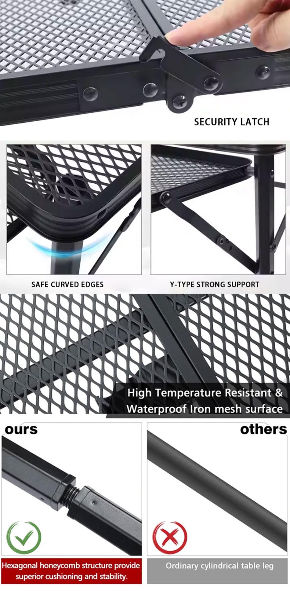 Построенный из высококачественного металла, он предлагает отличную стабильность и весовую способность, обеспечивая надежную поверхность для гриля и приготовления пищи. Складная конструкция обеспечивает легкую настройку, компактное хранилище и удобную переносимость.