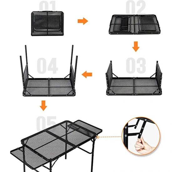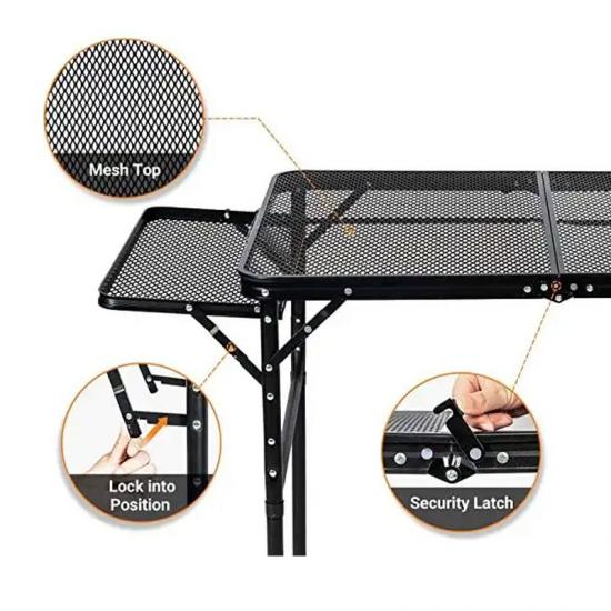 Продукт : На этом пикнике на открытом воздухе складывающаяся металлическая гриль -столик имеет две боковые полки, предлагающие стабильность, долговечность и удобство для семейного кемпинга, приготовления на открытом воздухе и встреч с барбекю.