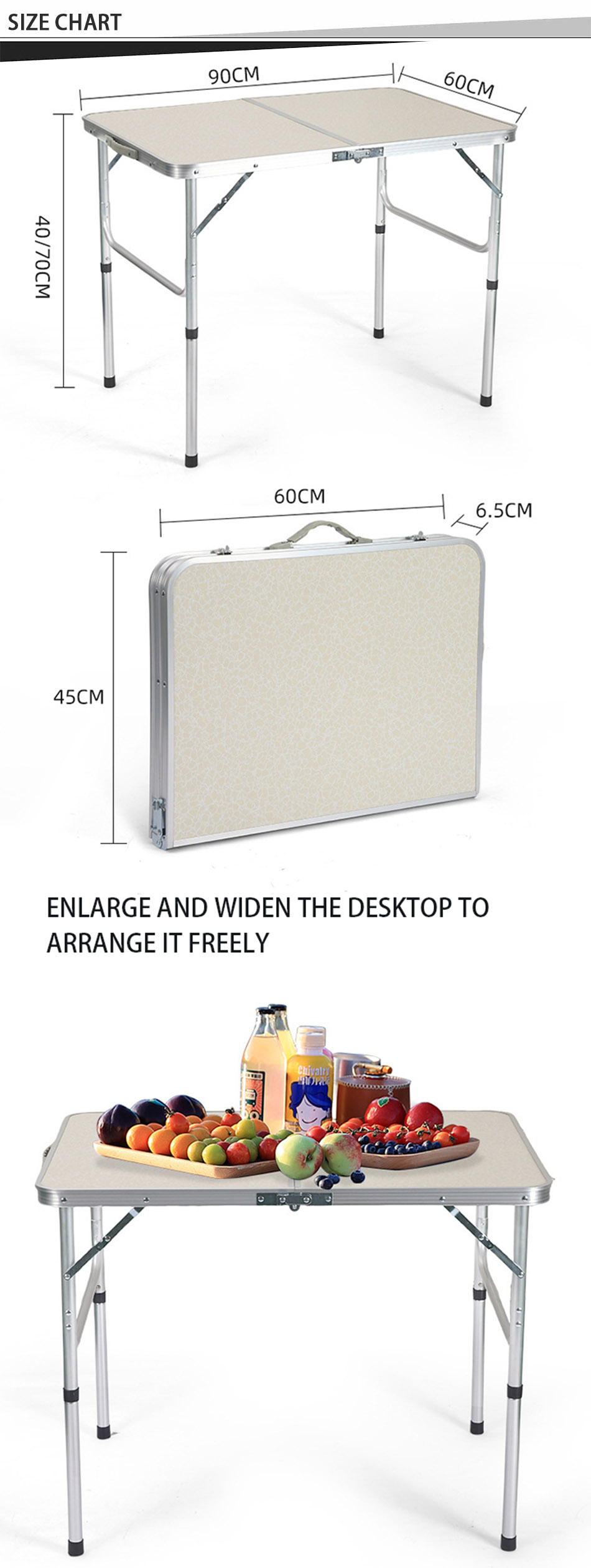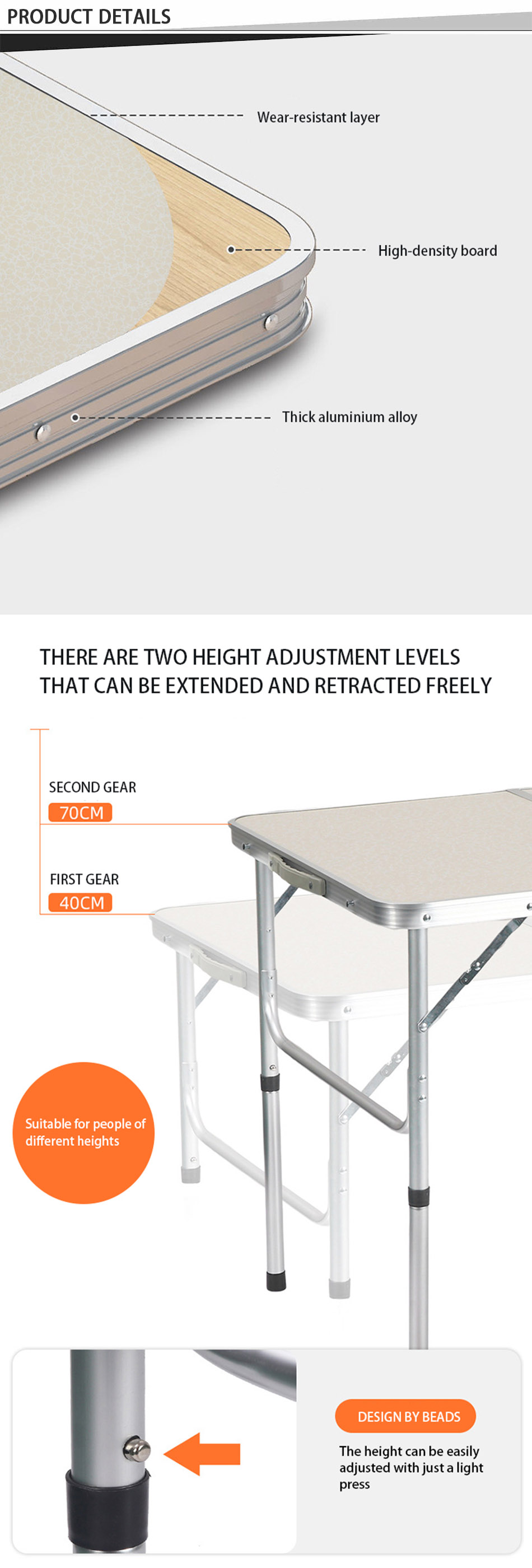 Продукт : Портативный складной стол из алюминиевого сплава с регулируемой высотой и многофункциональным назначением идеально подходит для пикников на свежем воздухе, пляжных дней, барбекю, кемпинга и путешествий благодаря простоте установки.
