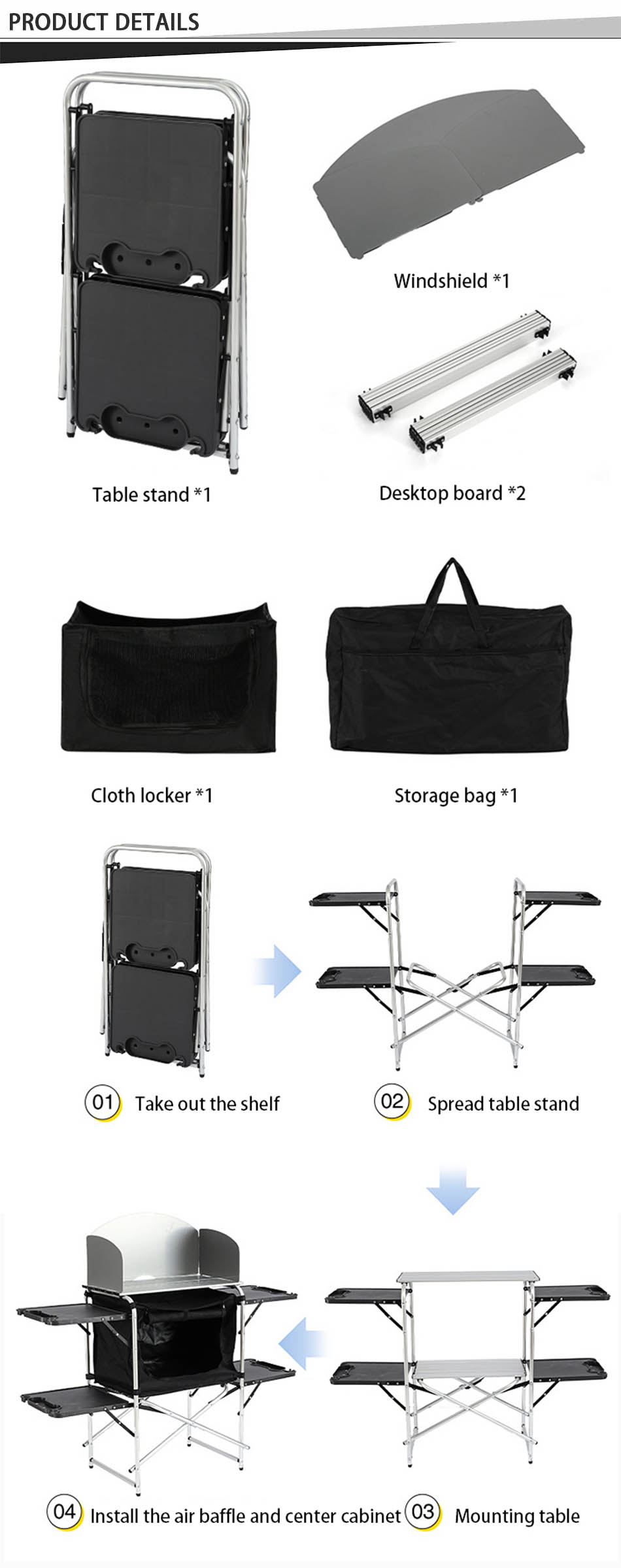 1. Конструкция складного походного стола : складная конструкция стола удобна для переноски и экономит место. 2. Легко собрать, другие инструменты не нужны, стол можно собрать всего за несколько секунд, что экономит время и усилия. 3. Супер прочный и стабильный: изготовлен из высококачественного алюминиевого сплава, прочный и долговечный, водонепроницаемый и легко чистится. 4. Индивидуальное обслуживание: на выбор предлагаются различные размеры и цвета, а также вы можете настроить логотип. 5. Многоцелевой: особенно подходит для активного отдыха, использования в качестве уличного стола для кемпинга, пеших прогулок, пикника, барбекю, стола для пикника, рыбалки, пляжа и использования в помещении.