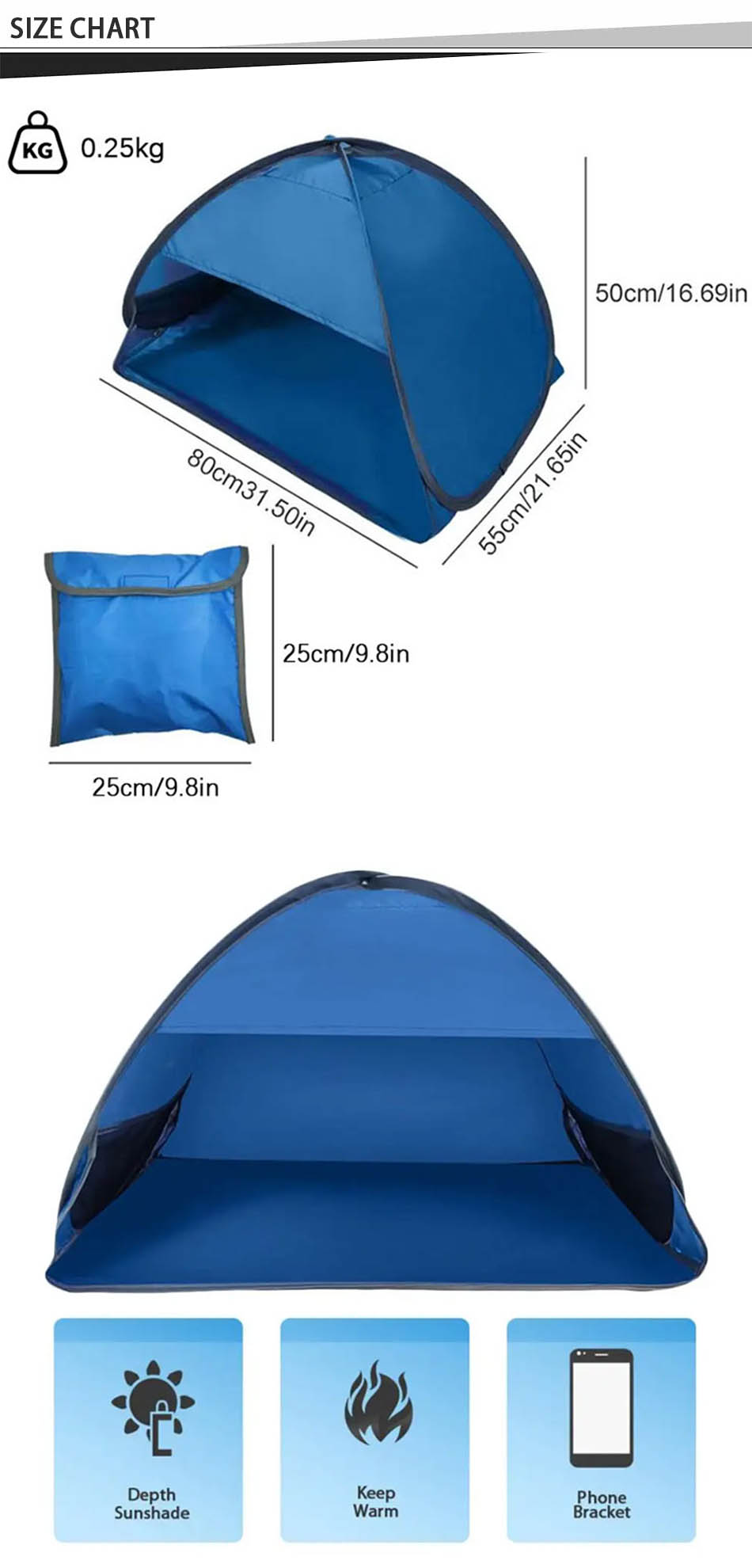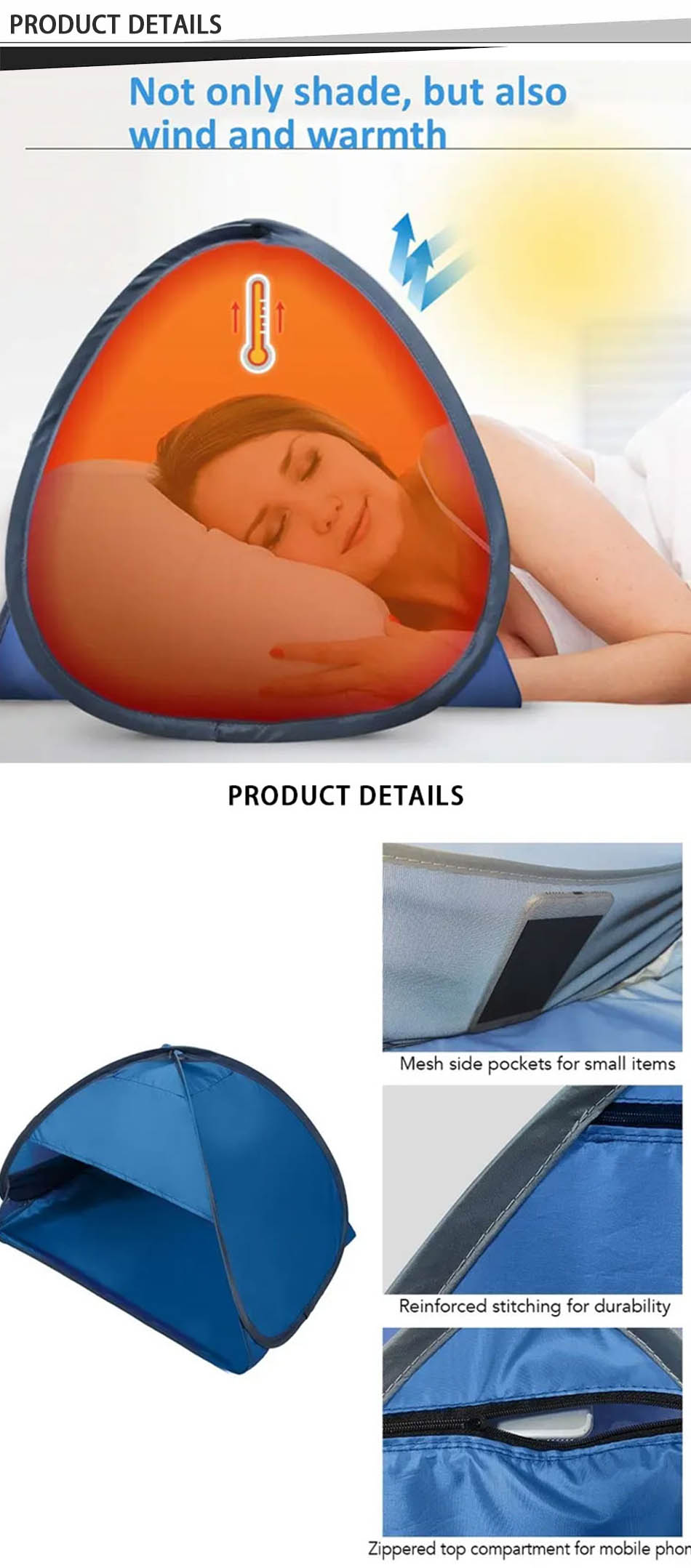 Продукт : Эта портативная мини-палатка для отдыха на природе обеспечивает водонепроницаемую, дышащую защиту во время сна на пляже, укрытия от солнца или кемпинга, гарантируя комфорт и тень в любое время и в любом месте.