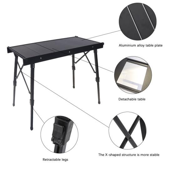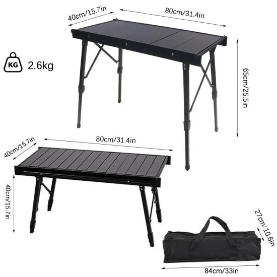 Продукт : Этот портативный многофункциональный металлический складной стол оснащен современным дизайном, идеально подходящим для открытого кемпинга, барбекю и пикников, предлагая долговечность, стабильность и легкую установку со конструкцией в стиле яичного рулона.