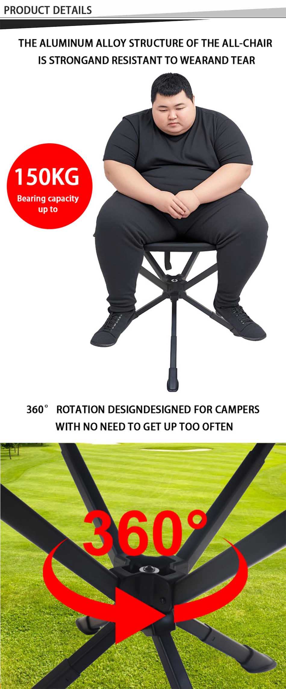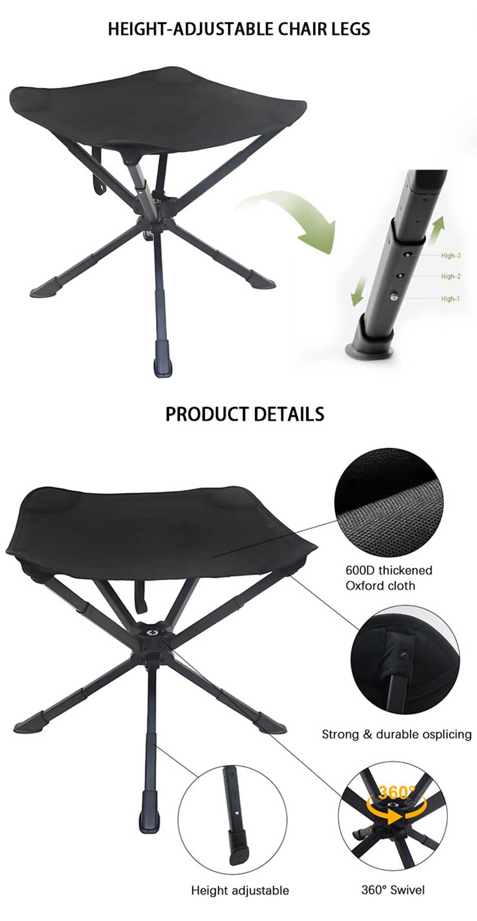 Продукт : Сверхлегкий складной табурет из алюминиевого сплава — это компактное, переносное сиденье, идеально подходящее для кемпинга, барбекю, рыбалки и использования на открытом воздухе, отличающееся прочностью и простотой транспортировки.