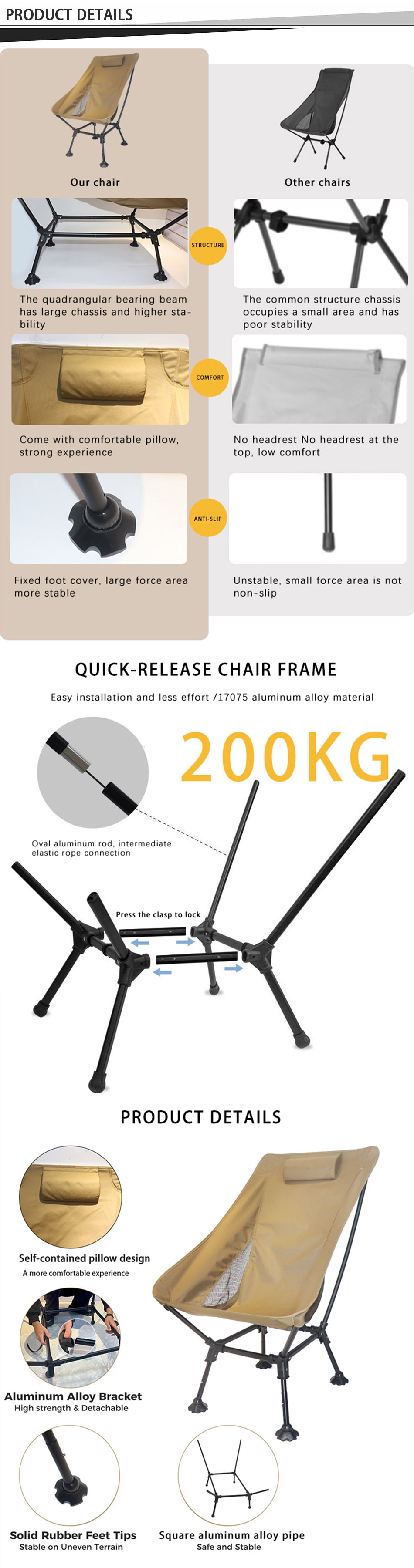 Бренд : ANHUI FEISTEL FACTORY Сопутствующее производство : OEM и ODM Продукт : Складное алюминиевое портативное кресло для кемпинга на открытом воздухе, удобное и портативное, вы можете наслаждаться отдыхом и комфортом во время кемпинга.